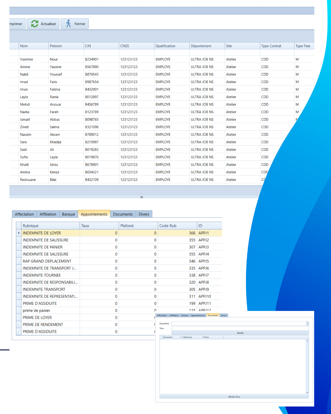 - Documents associés : Possibilité de joindre des copies numériques de documents importants tels que la carte d'identité, le contrat de travail, les diplômes, les certificats, etc.