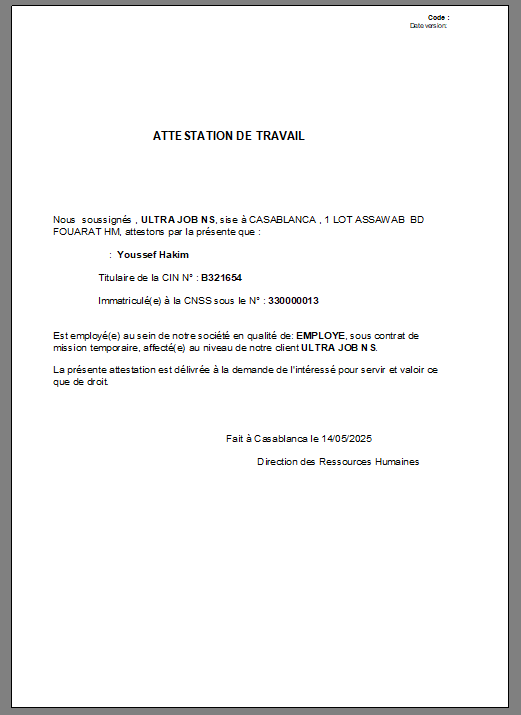 - Génération automatique d'attestations de travail pour les employés actifs et sortants.