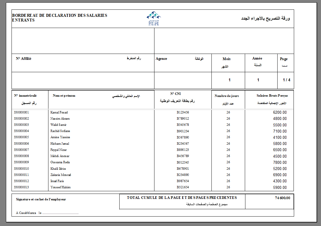 - Génération automatique de l'état 9421, document récapitulatif des salaires et des cotisations sociales destiné à la CNSS.