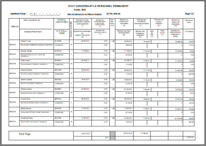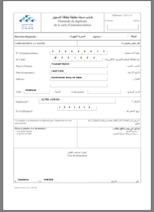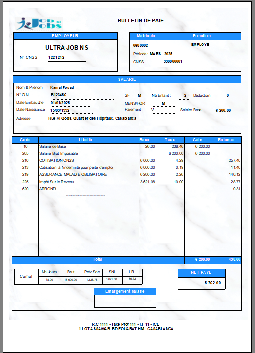 - Informations sociales et fiscales : Numéro de sécurité sociale (N° CNSS), régime de sécurité sociale,