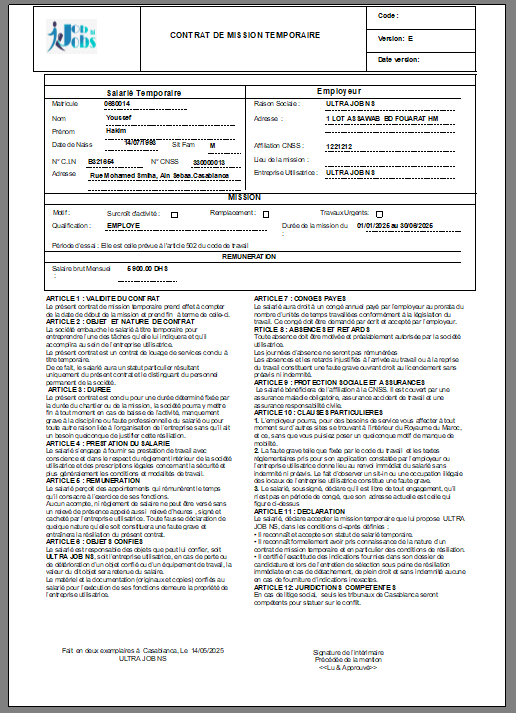 - Génération automatique des contrats de travail pour les nouvelles embauches.