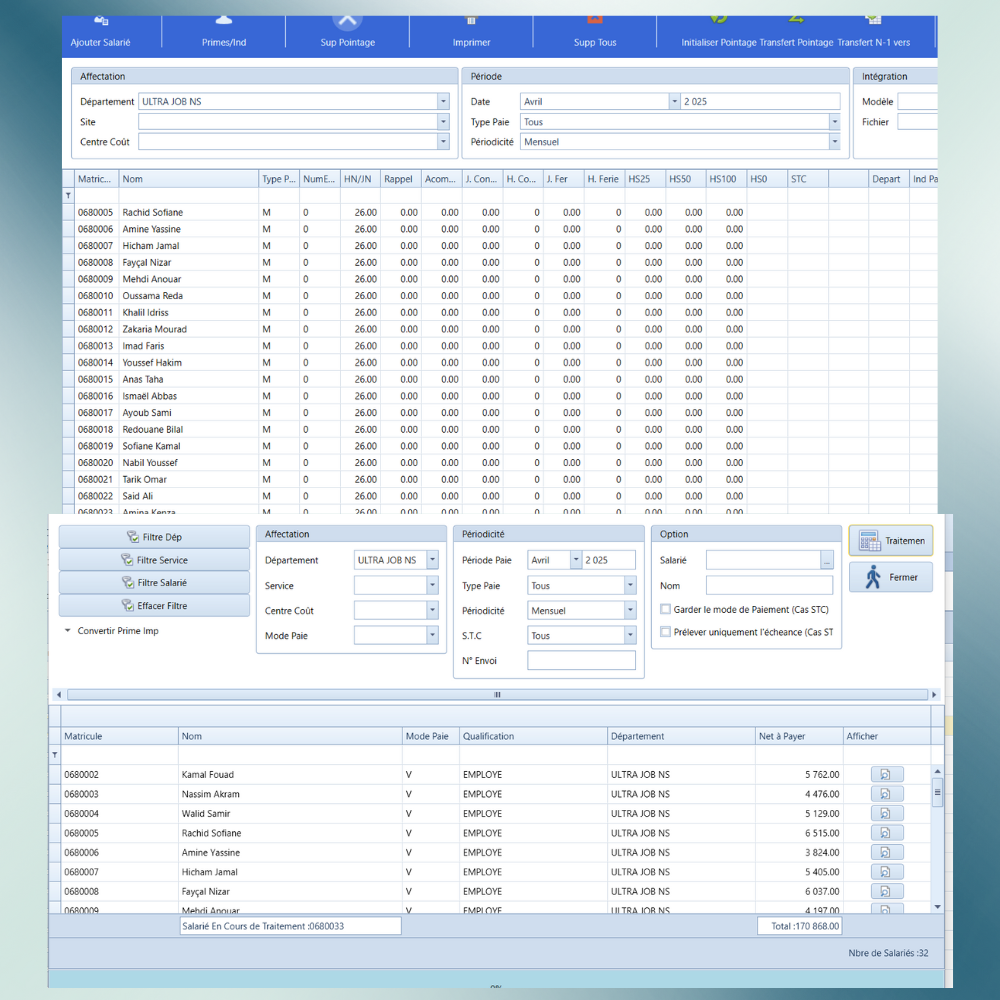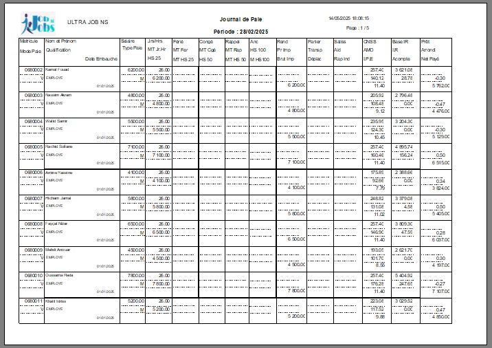 - Création et impression des bulletins de paie mensuels pour chaque salarié, conformément aux exigences légales.